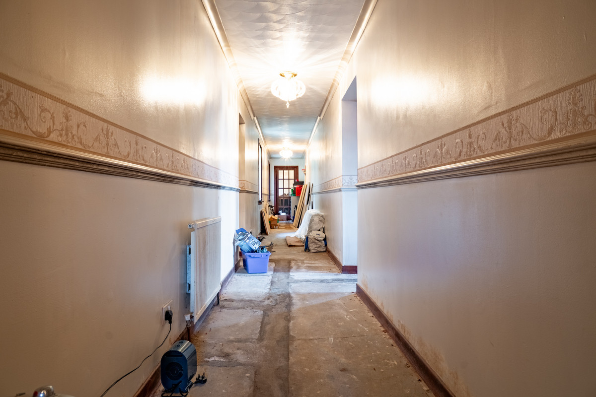 A private gravel driveway leads up to the house, where the charming traditional exterior is surrounded by mature trees and greenery. Stepping inside, the spacious hallway leads to the impressive main living room, a generously sized and inviting space with dual-aspect windows that bathe the room in natural light. This versatile area provides ample room for a variety of furniture layouts, whether you envision a cosy family lounge, an elegant entertaining space, or a relaxed retreat.
