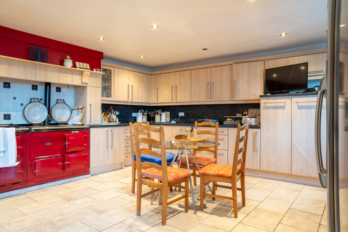The heart of the home is the vast kitchen and dining space, featuring wood cabinetry, black worktops, tiled flooring and a stunning red AGA. The extensive worktops and storage make this a fantastic space for cooking and entertaining, while the traditional styling enhances the Highland charm. The room is sufficiently sized to accommodate a family dining table and chairs, creating a warm and inviting space. The adjoining utility room provides additional storage and laundry facilities.