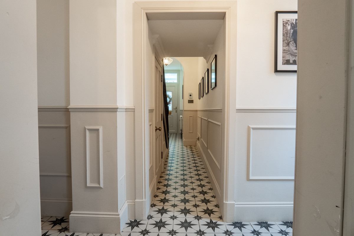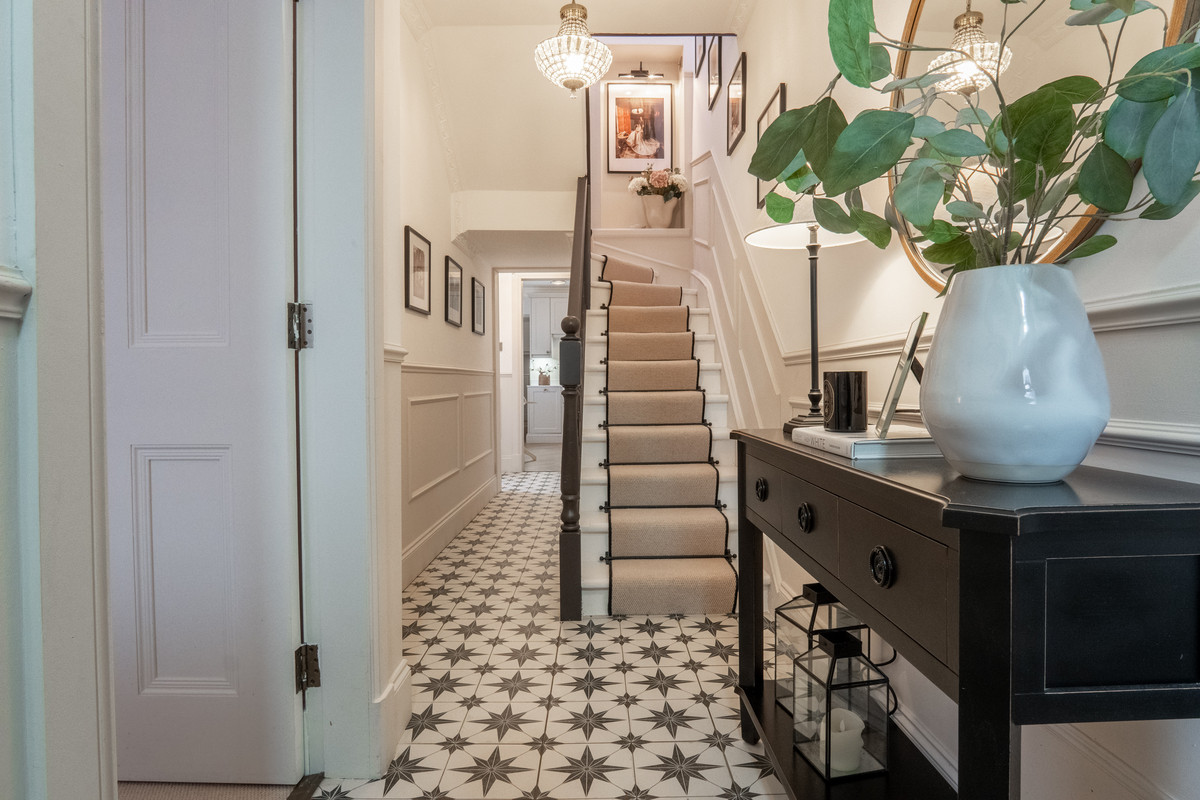 Stepping inside, the entrance hallway immediately impresses with its black and white star-patterned floor tiles, creating a striking contrast against the wainscot panelling in soft neutral tones. The white-painted staircase is enhanced by a black banister, while a delicate cream carpet runner adds a luxurious finishing touch.
