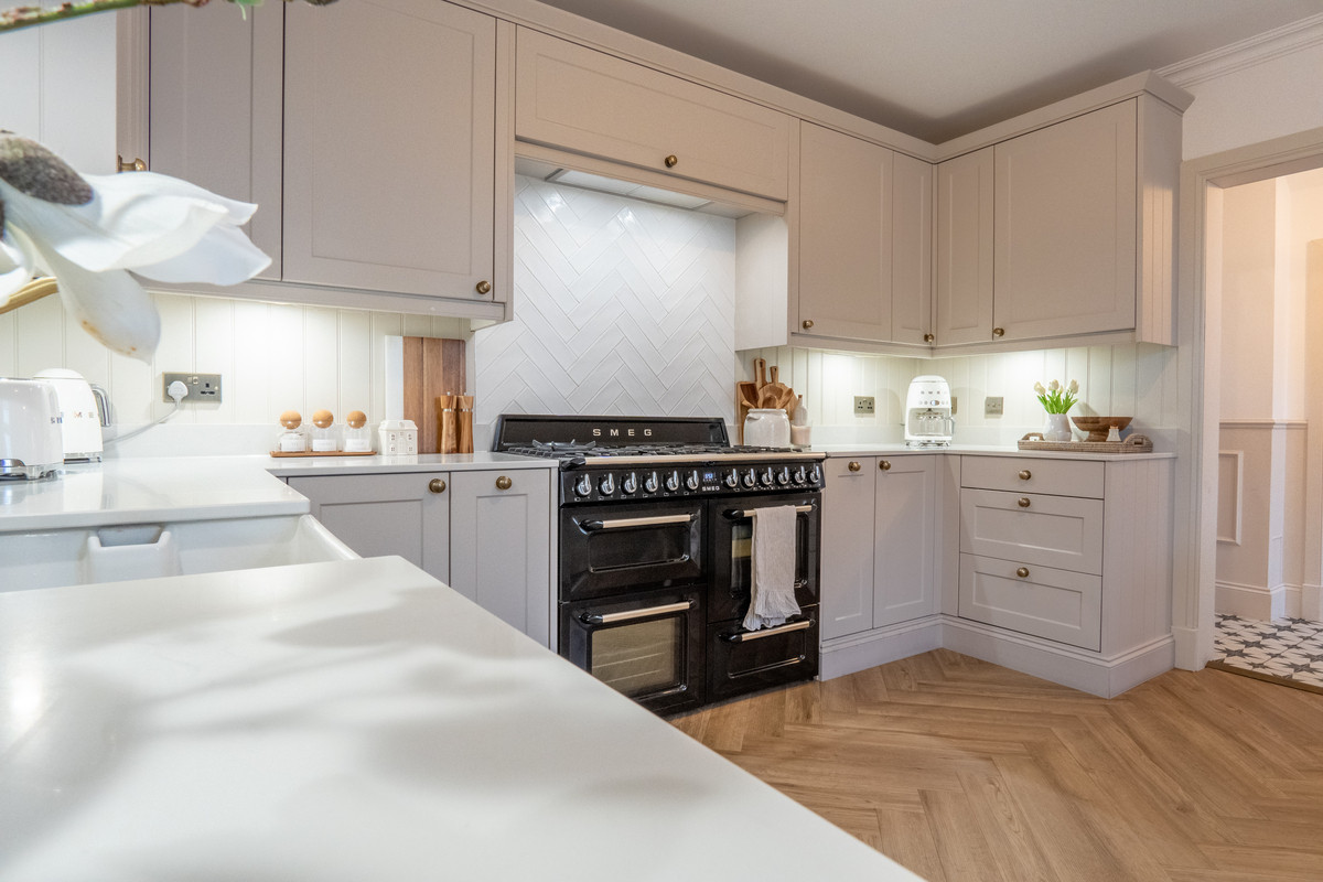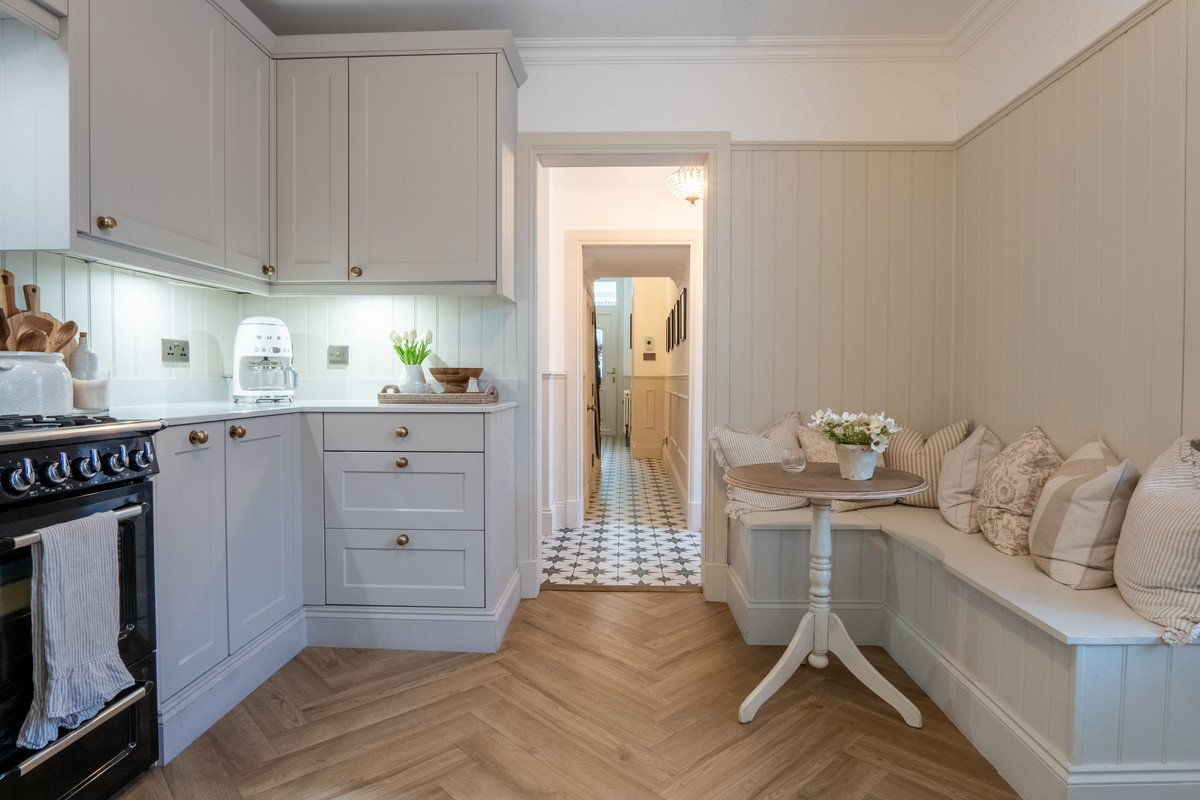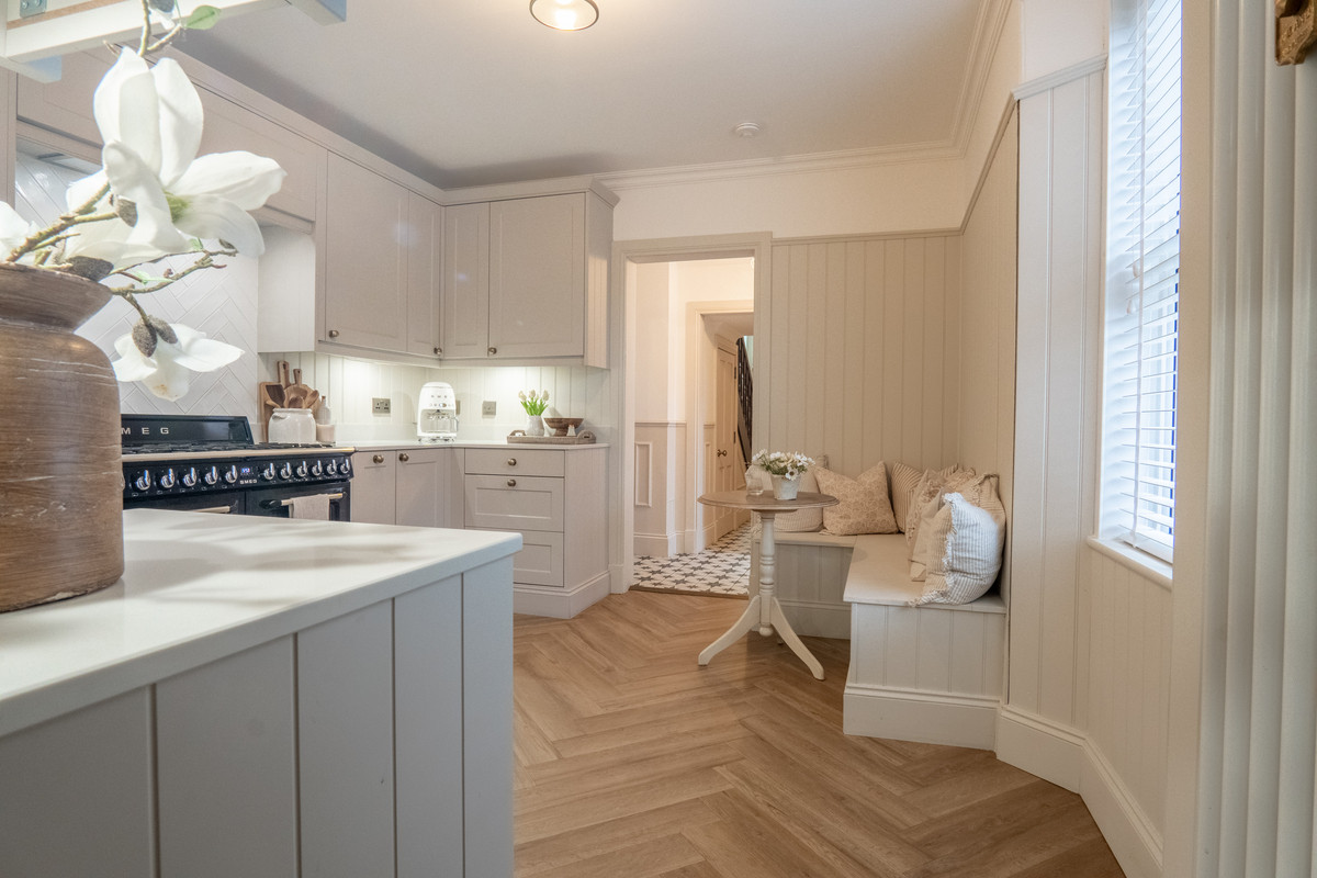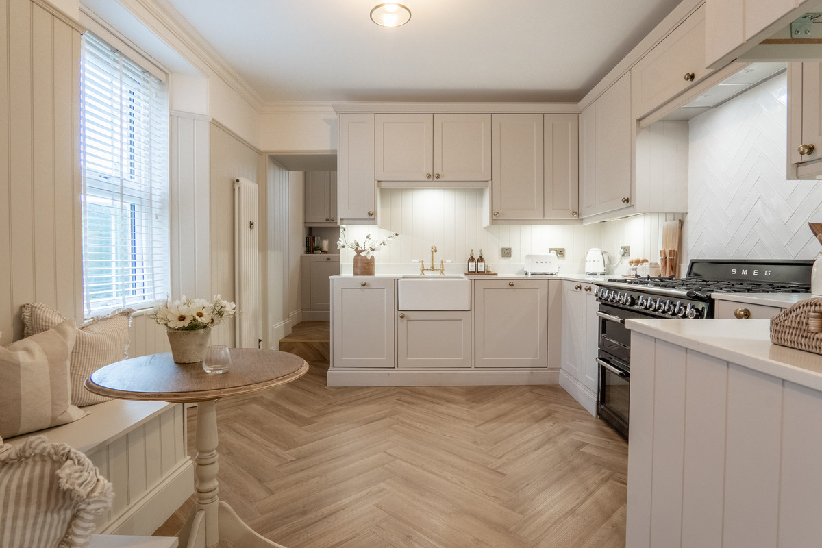 The kitchen is a masterpiece of style and function, featuring a Belfast sink with gold taps, soft cream cabinets and luxurious white granite worktops. A large Smeg double oven takes centre stage, perfect for culinary enthusiasts, while under-cabinet lighting creates a warm and welcoming glow. A built-in seating area in the corner offers a relaxed spot to enjoy coffee or could be paired with a small table for informal dining. Wooden flooring adds to the charm, while a tall white radiator ensures comfort.