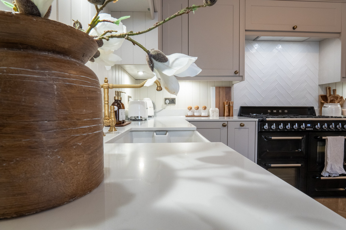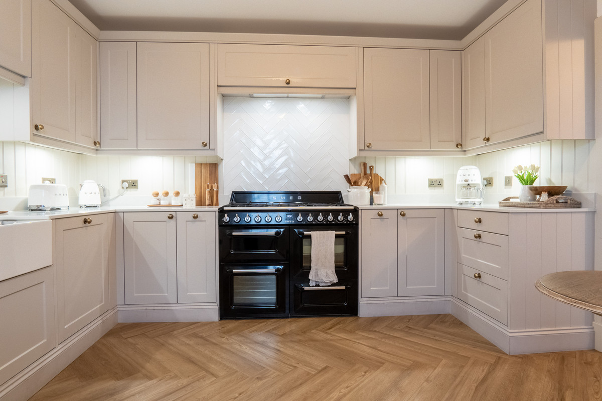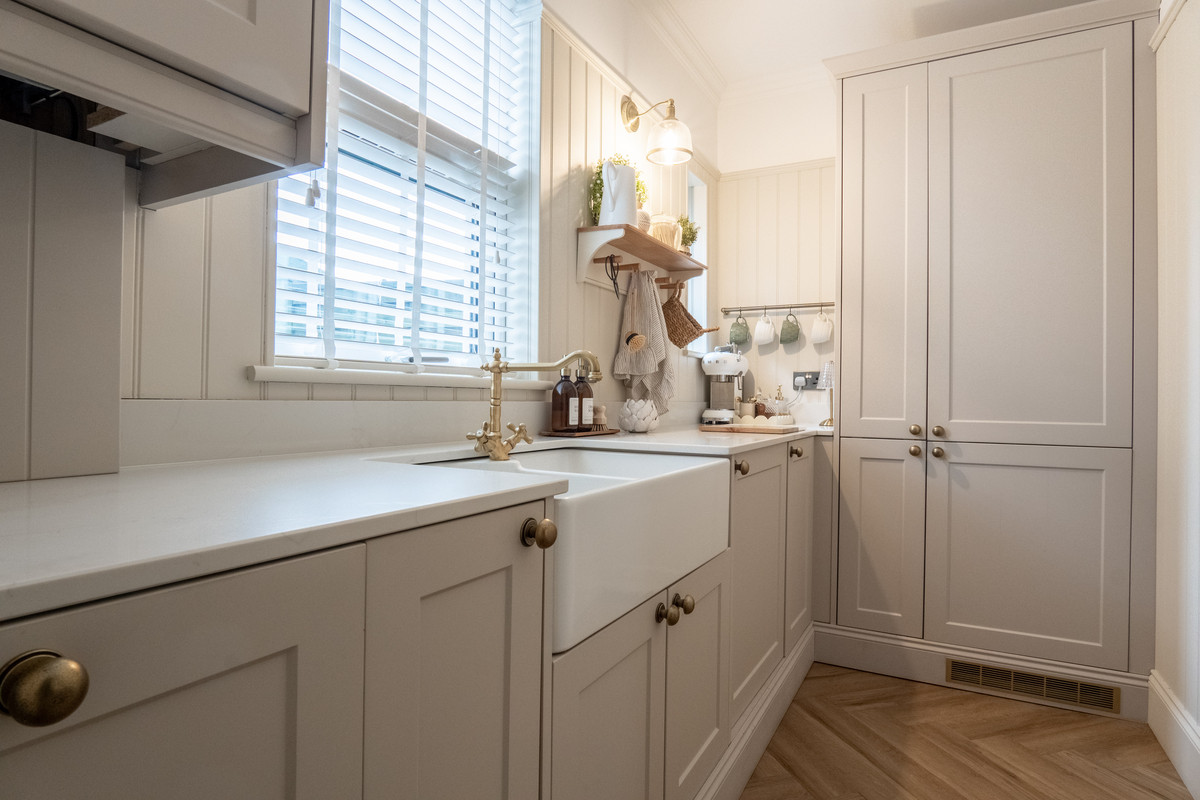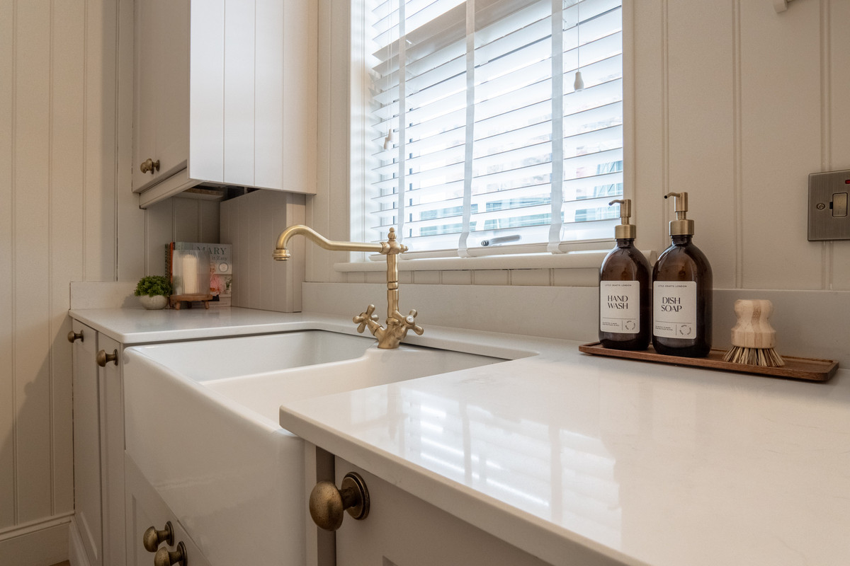 Leading from the kitchen, the utility room matches its elegant design, also featuring a Belfast sink with gold taps, identical cabinets and ample worktop space. This practical addition allows for laundry and storage to be kept separate from the main living spaces.