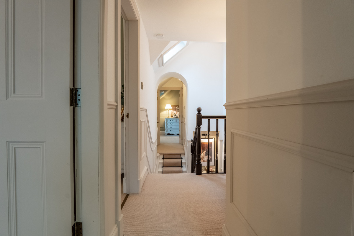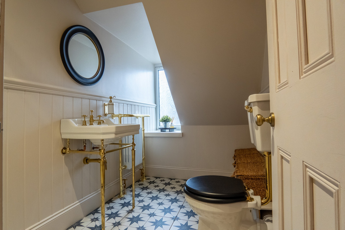Upstairs, the landing continues the refined design, with wainscot panelling and soft neutral décor, creating a seamless transition to the bedrooms. The shower room is a true showstopper, with a beautifully designed sink set on a gold stand, gold piping and accessories. There’s an opulent walk-in shower featuring gold fixtures and striking tiled surrounds. The black and white star-patterned floor tiling echoes the hallway, creating a cohesive and luxurious look.