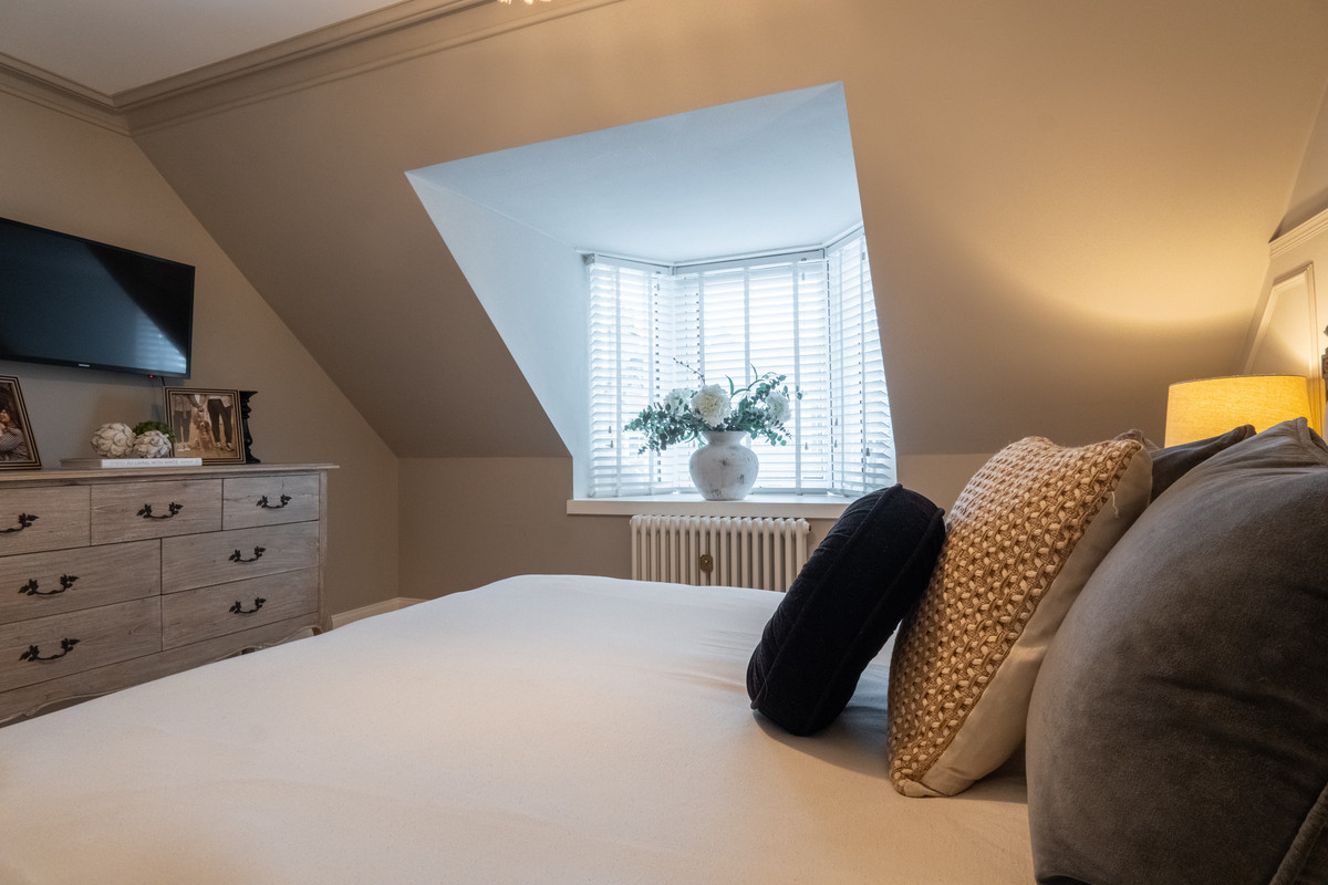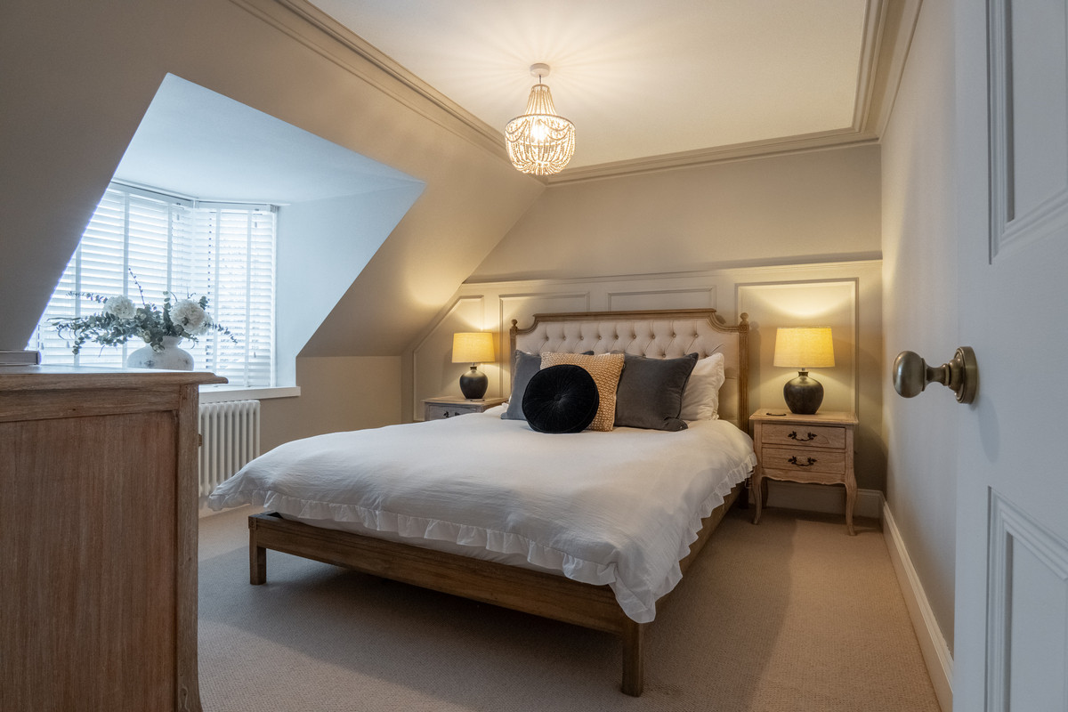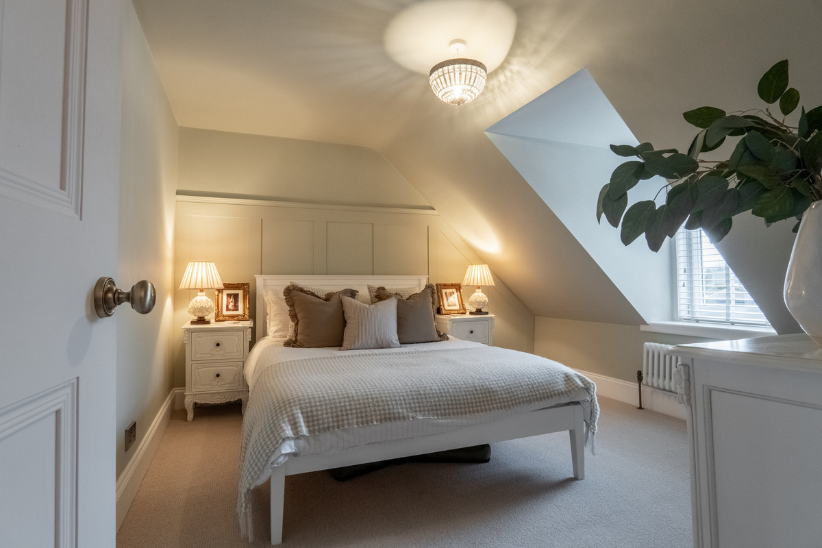 Each of the three double bedrooms is immaculately designed, with sloping ceilings, wainscot panelling on the feature walls and soft cream carpeting for added warmth and comfort. A traditional-style radiator sits beneath the bay window in each room, enhancing the period charm. Each room is a good size, allowing for additional furniture to suit every need.