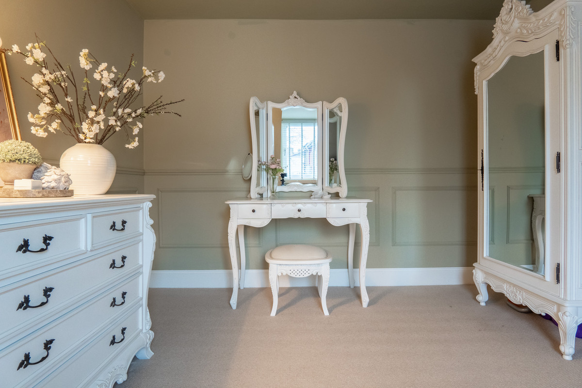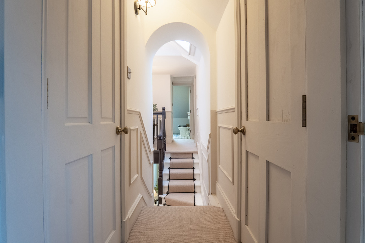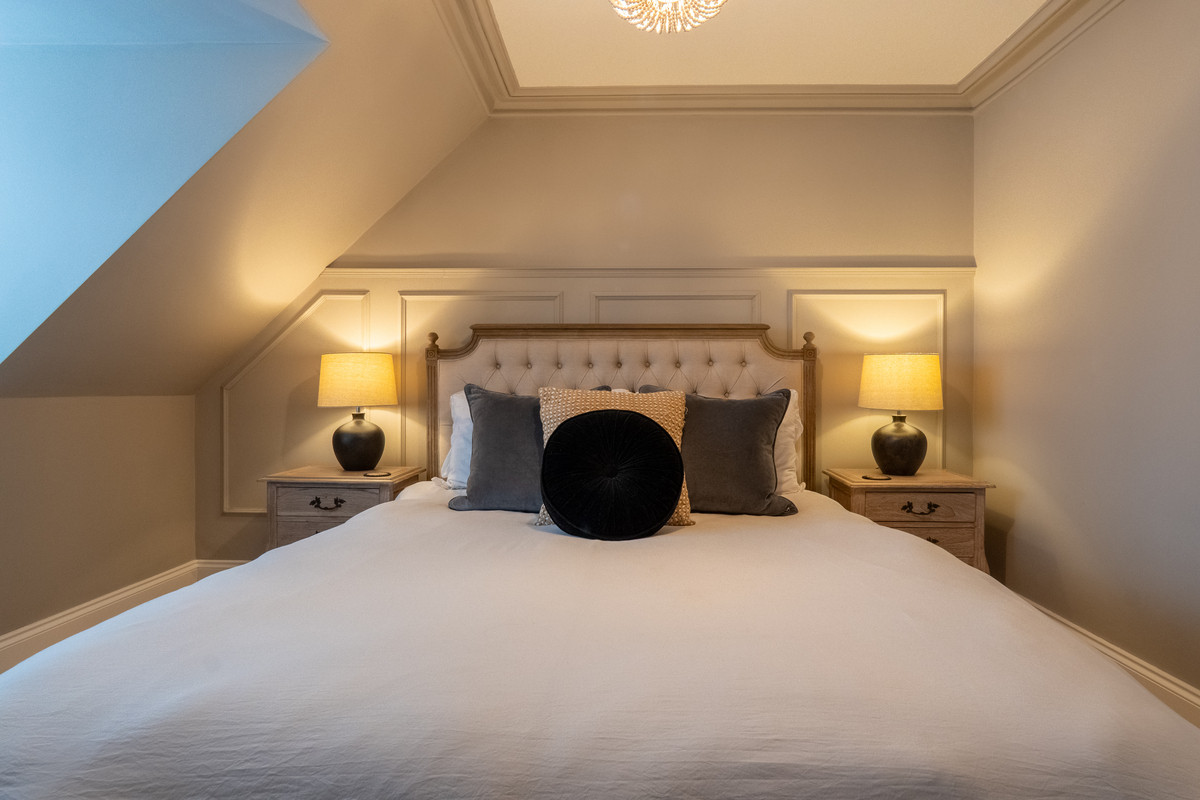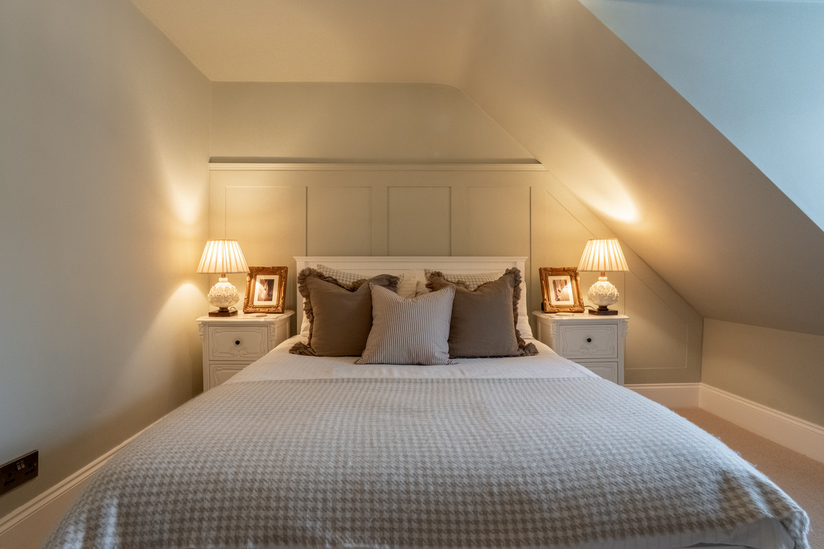 Each of the three double bedrooms is immaculately designed, with sloping ceilings, wainscot panelling on the feature walls and soft cream carpeting for added warmth and comfort. A traditional-style radiator sits beneath the bay window in each room, enhancing the period charm. Each room is a good size, allowing for additional furniture to suit every need.
