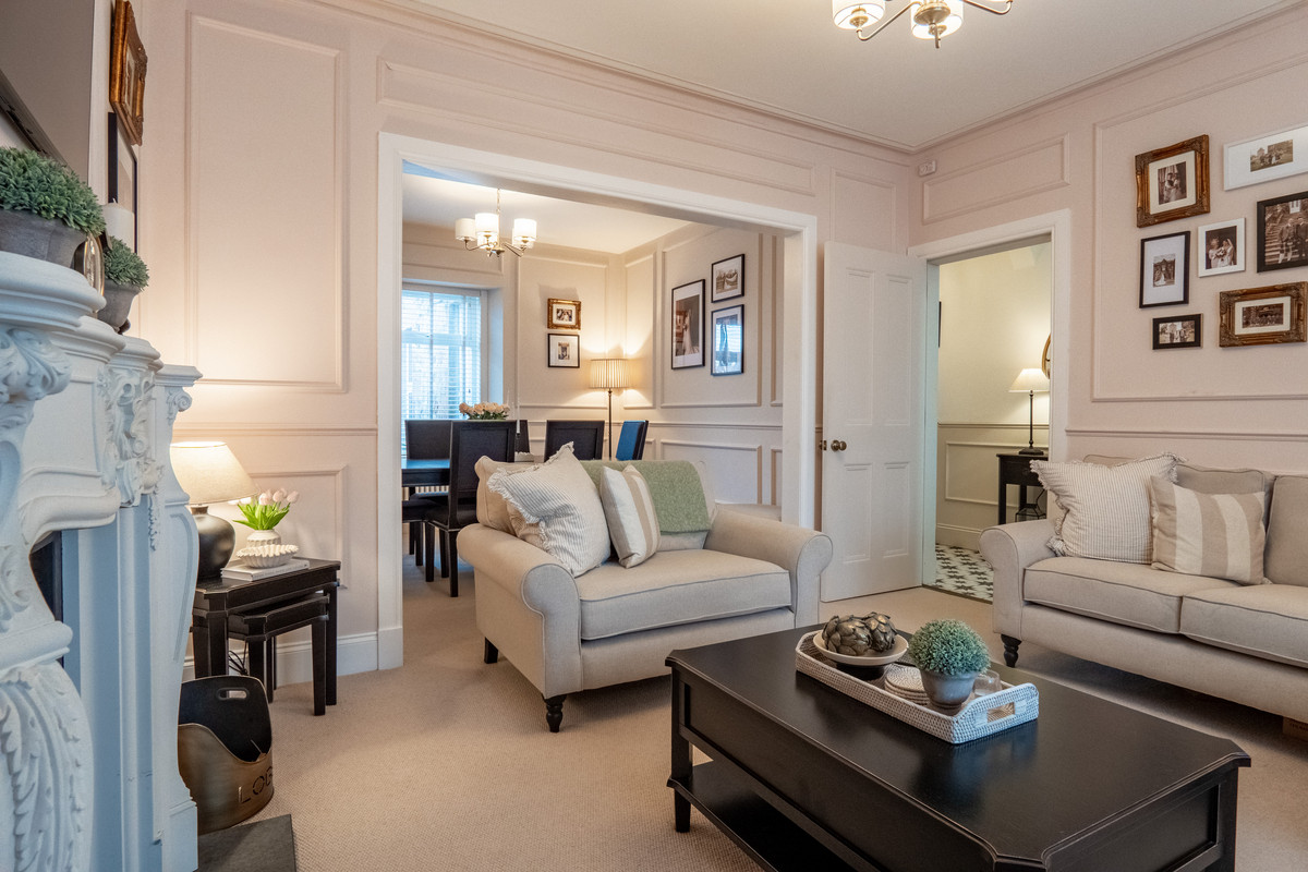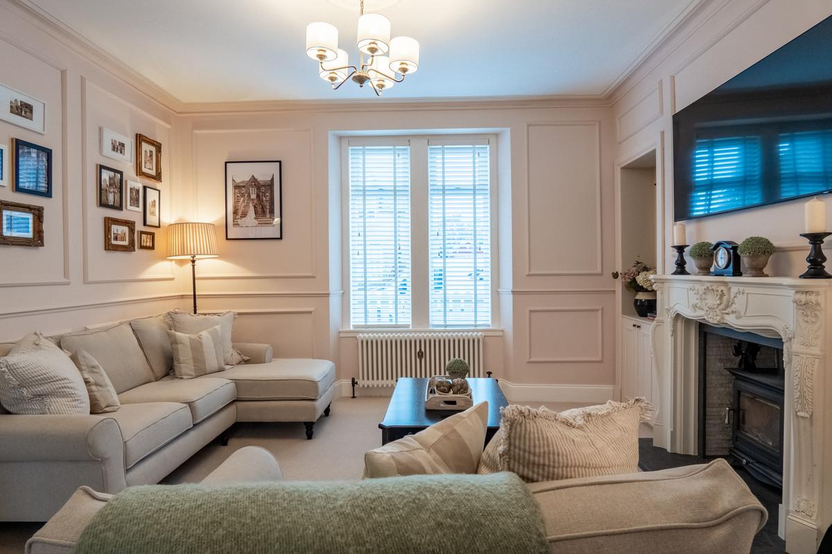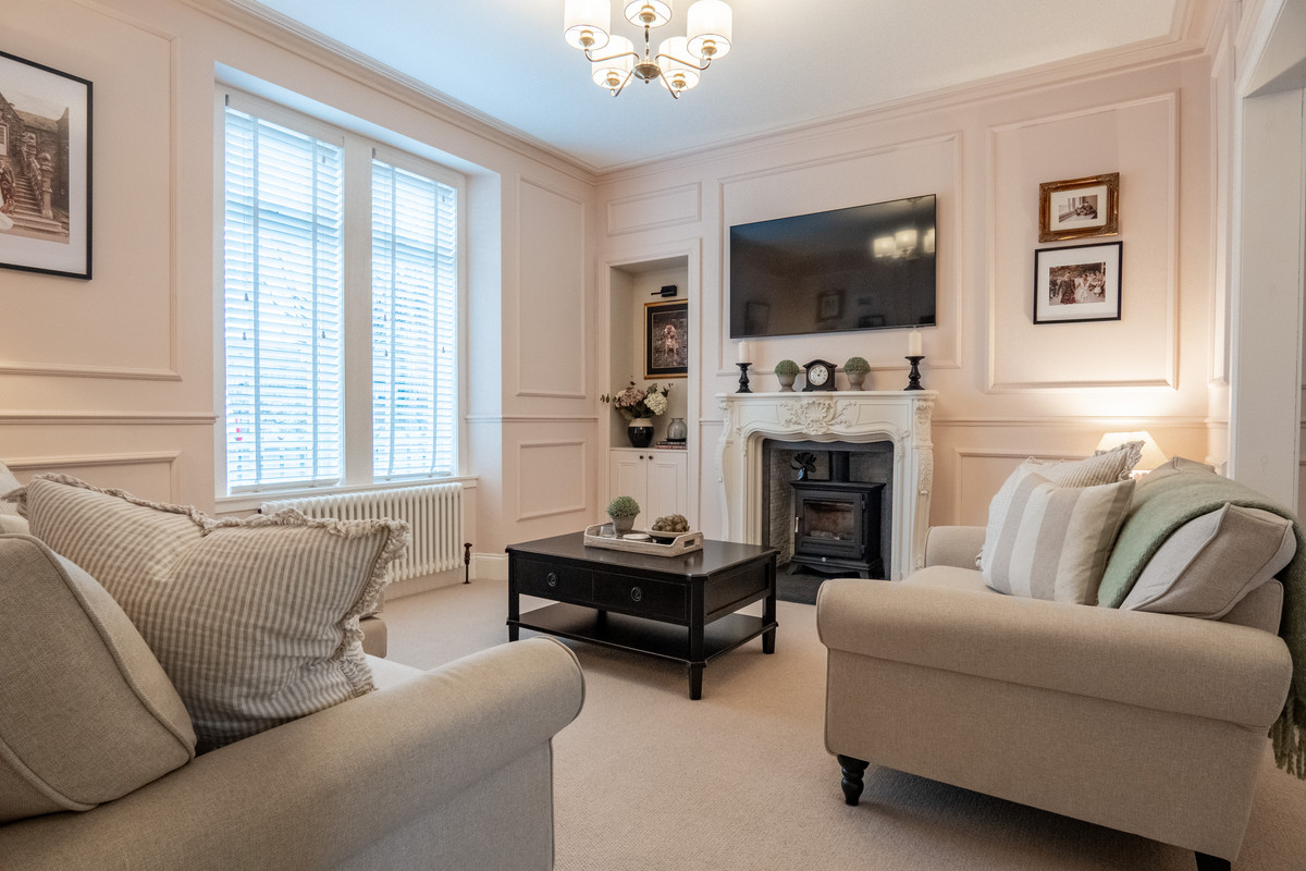 The sitting room is a refined yet cosy space, featuring a grand decorative white fireplace housing a multi-fuel stove, perfect for creating warmth and ambiance. Soft cream carpeting, traditional wainscot panelling and a built-in alcove cupboard beside the fireplace complete the room’s charming appeal. A front-facing window with a classic radiator beneath allows natural light to enhance the inviting atmosphere.