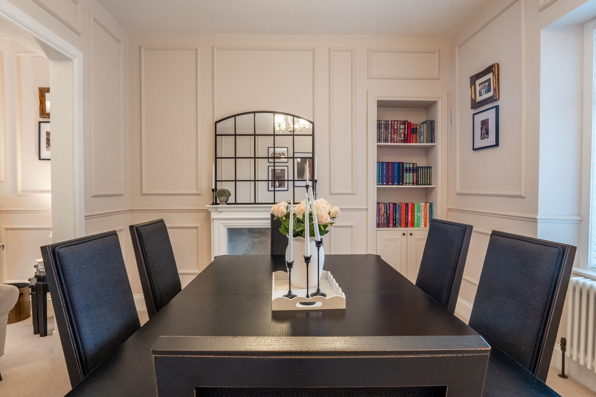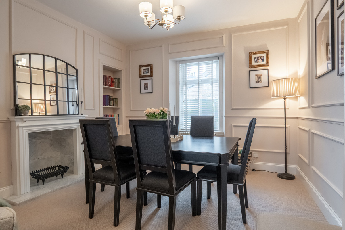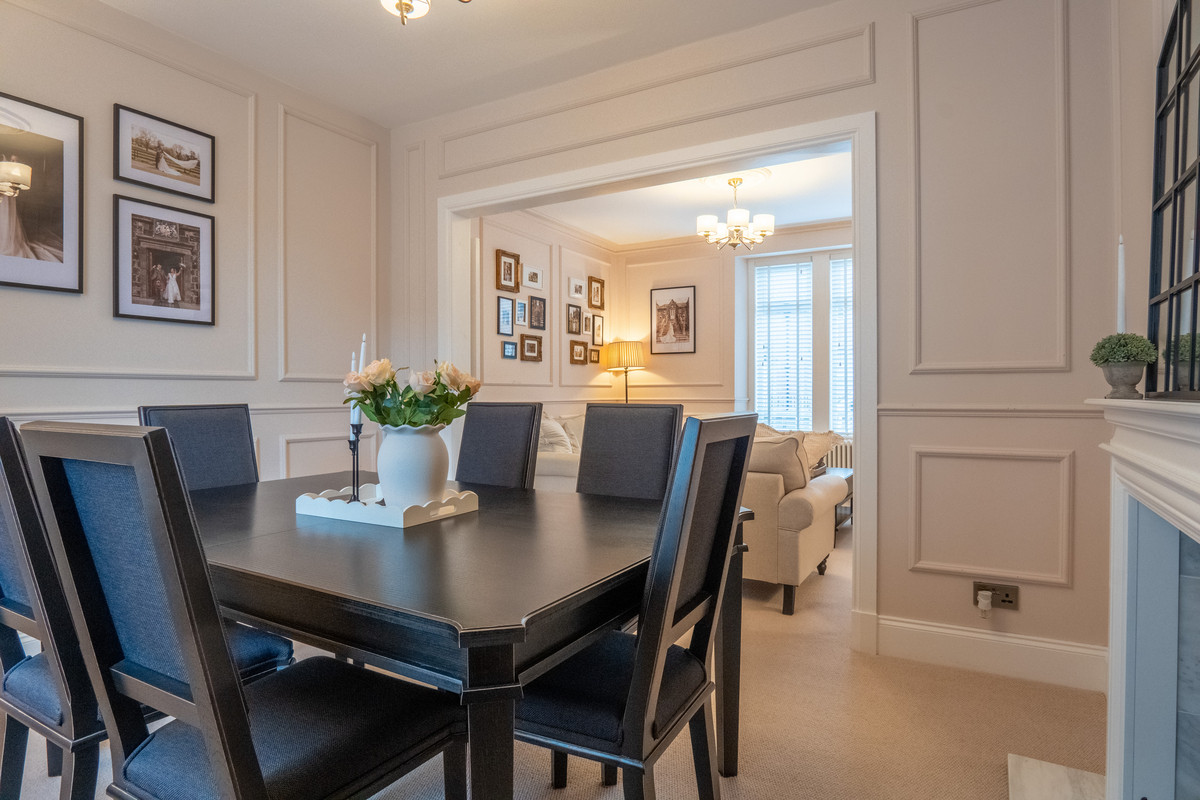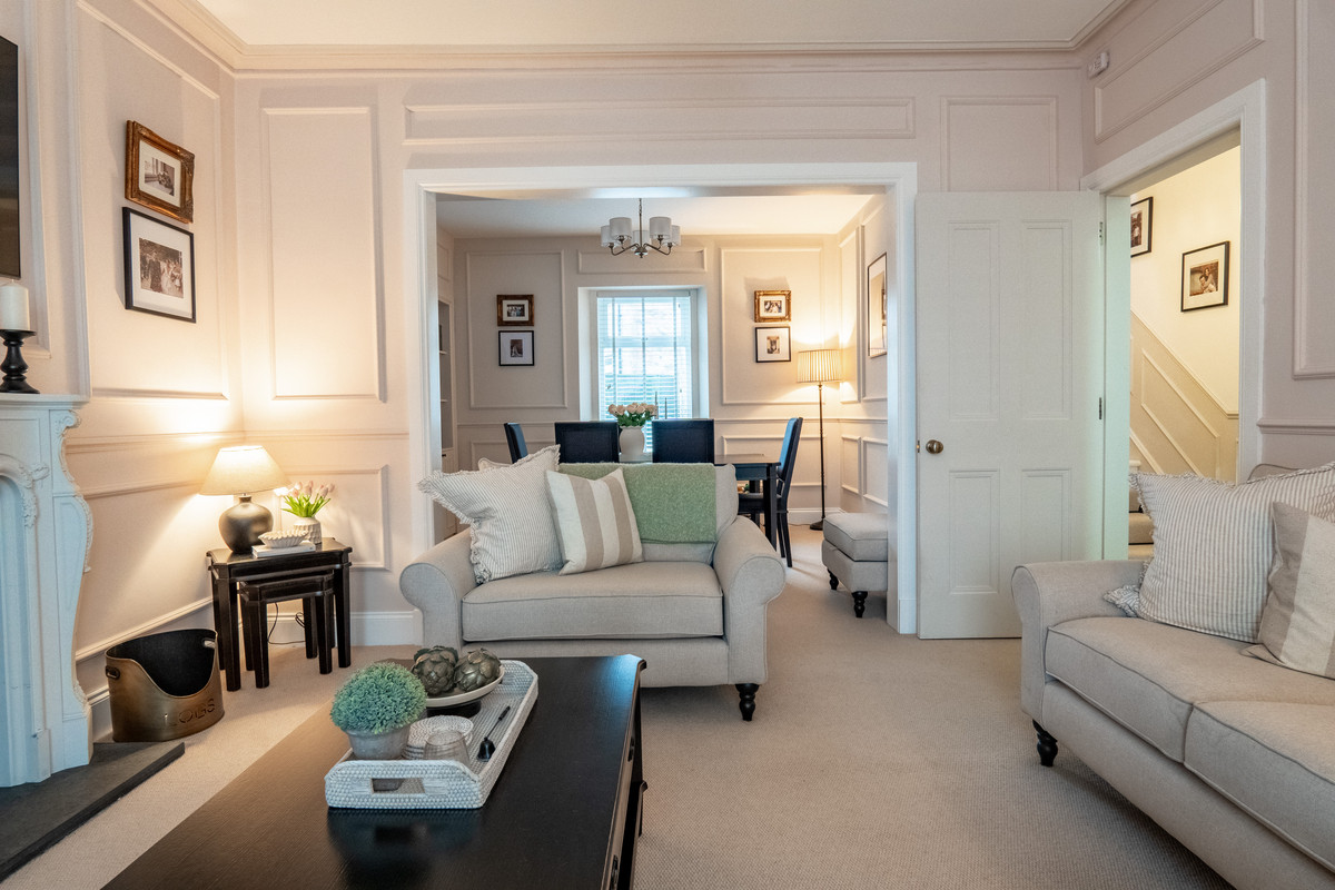 The sitting room is a refined yet cosy space, featuring a grand decorative white fireplace housing a multi-fuel stove, perfect for creating warmth and ambiance. Soft cream carpeting, traditional wainscot panelling and a built-in alcove cupboard beside the fireplace complete the room’s charming appeal. A front-facing window with a classic radiator beneath allows natural light to enhance the inviting atmosphere.