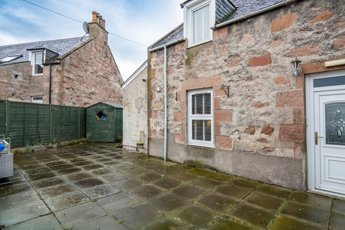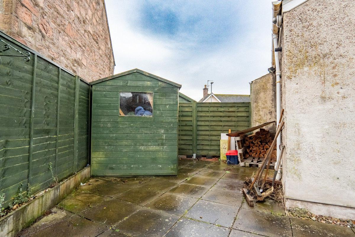 Outside, the private paved garden offers a low-maintenance outdoor space, perfect for relaxing or dining al fresco. A timber shed at the far end provides convenient storage.