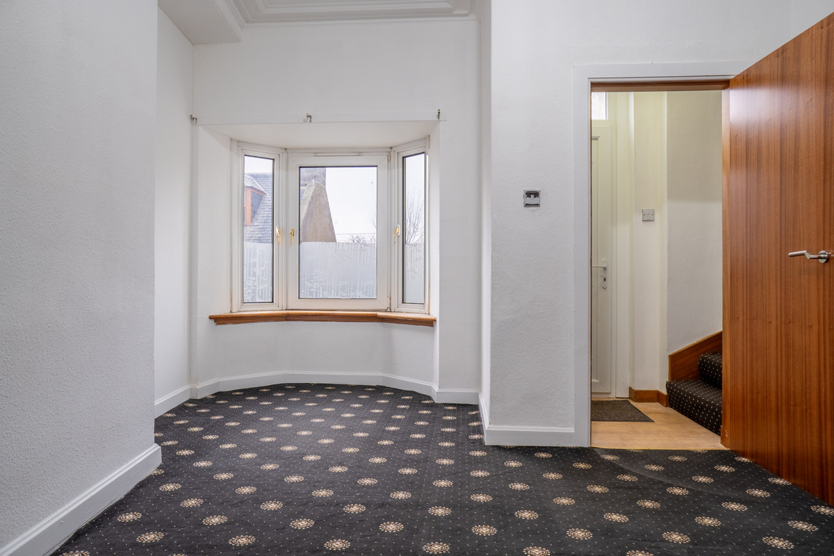 The front door opens into a compact entry area, where a blue-patterned carpeted staircase leads to the upper level. Off this space, the ground-floor bedroom offers a generous layout with a large alcoved window, built-in storage cupboard and radiators for comfort. This versatile room can also serve as a second lounge, playroom or home office, catering to a variety of needs.