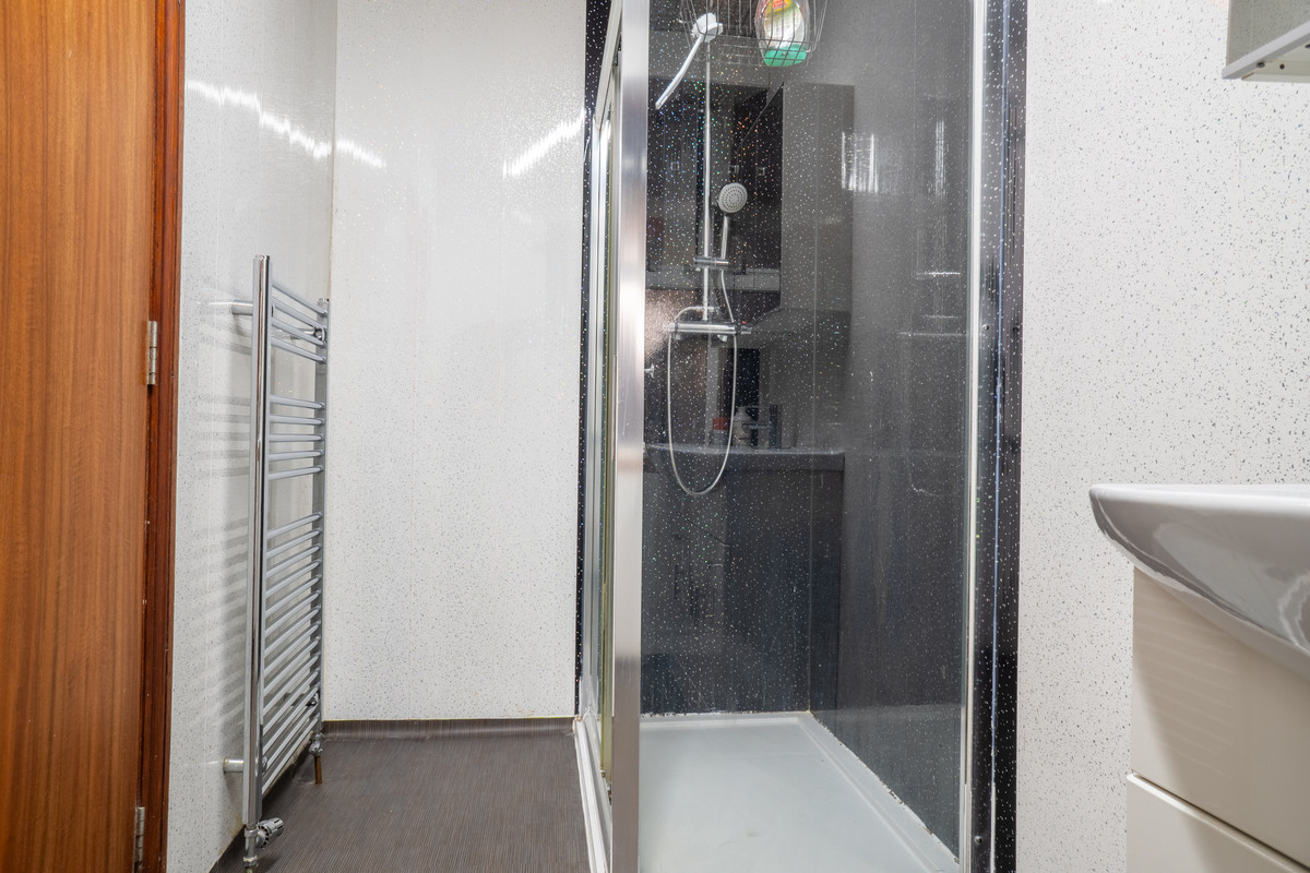 The shower room continues the contemporary theme, featuring crisp white walls, a mirrored bathroom cabinet for convenient storage and striking sparkling black wetwall panels within the shower cubicle. The two upstairs bedrooms offer ample space and versatility. The master bedroom features a bay window, blue carpet and a handy alcove cupboard for additional storage. The second bedroom, with its playful road-style carpet, is ideal for a child’s room or could easily be transformed into a creative or study space.