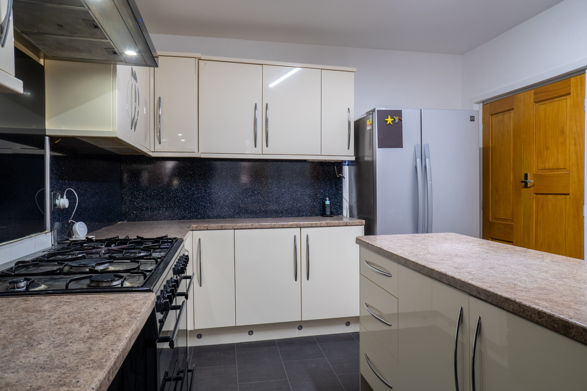 The kitchen is a real stand-out room, offering a sleek and modern design with glossy white cabinets, sparkling black splashback panels and contrasting grey stone-effect worktops. A central island with extra storage enhances the kitchen’s functionality, while the spacious layout provides room for dining or casual entertaining. With its pristine condition and thoughtful design, this kitchen is truly the heart of the home.