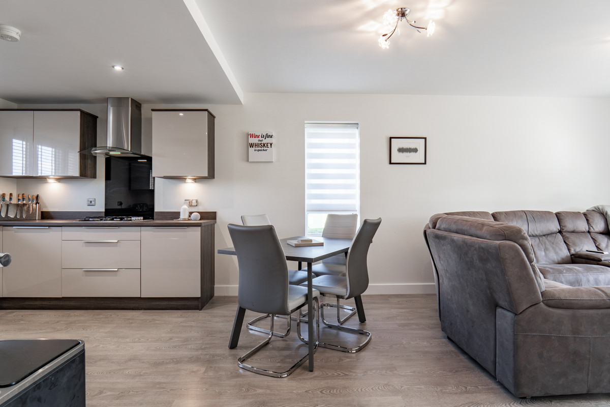 The heart of the home is the open plan living, dining and kitchen area. The kitchen is fitted with glossy light coloured cabinets edged by dark wood sides with matching wood effect worktops and kickstrips, giving it a striking modern look. A tall bank of units houses integrated appliances including a built-in oven and microwave at eye level, while on the opposite wall a gas hob with extractor hood sits above. A dark composite sink is set neatly beneath the kitchen window, and under-unit lighting ensures the worktops are well illuminated. Wooden flooring continues through the space, complemented by ceiling spotlights.