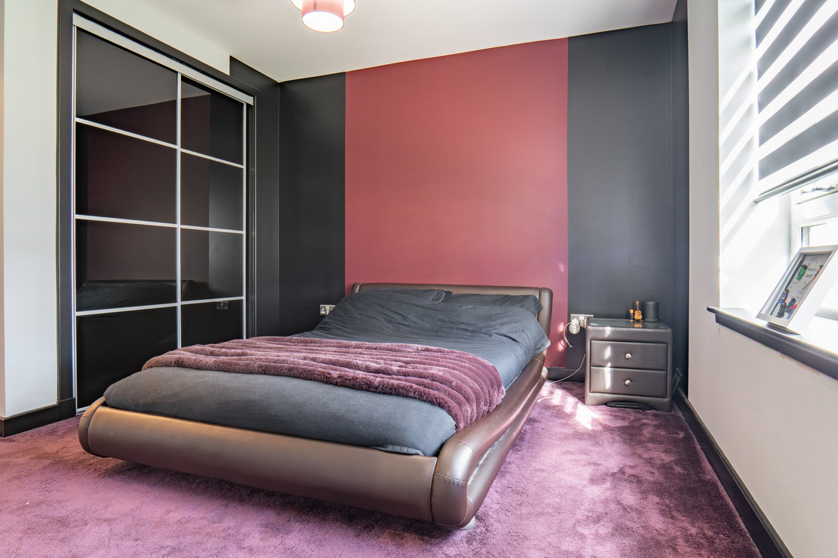 The main bedroom is finished in a bold, contemporary style. A feature wall in black and red gives strong character, while built-in wardrobes with glossy black doors line one side. A plush purple carpet adds comfort underfoot with a large window ensuring the room remains bright. Its en-suite shower room features a generous shower enclosure with mains shower, a floating sink with storage below, a modern toilet and a large mirror mounted on the wall.