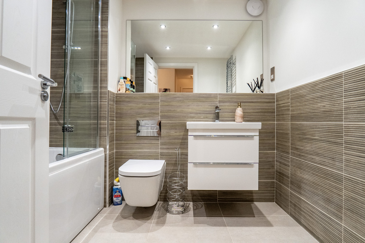 The main bathroom continues the modern theme with a white suite comprising bath, toilet and sink. A mains shower is fitted above the bath with a folding glass screen fitted alongside for practicality. Textured tiling surrounds the bath and sink areas, spotlights brighten the ceiling and a chrome ladder radiator completes the look.