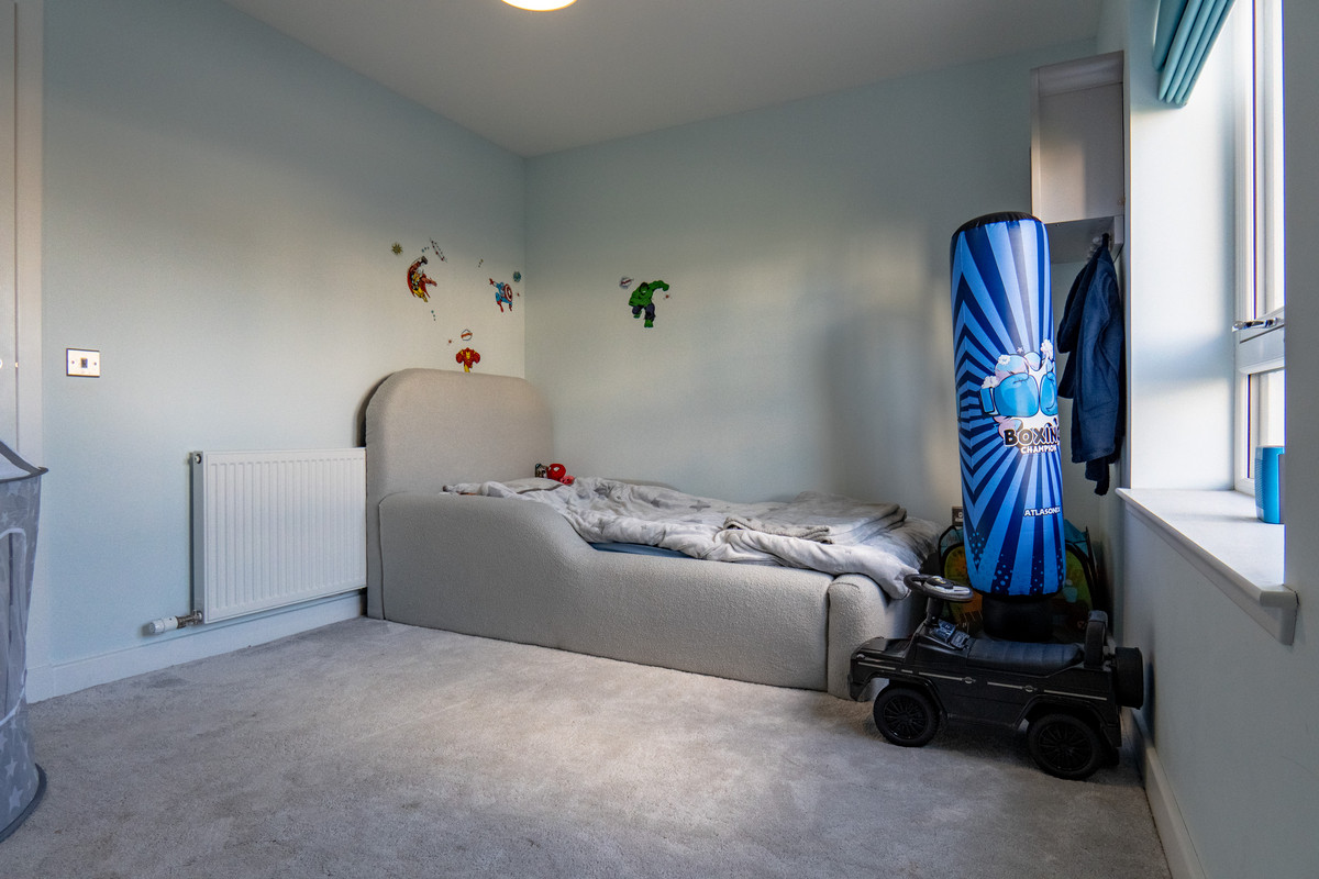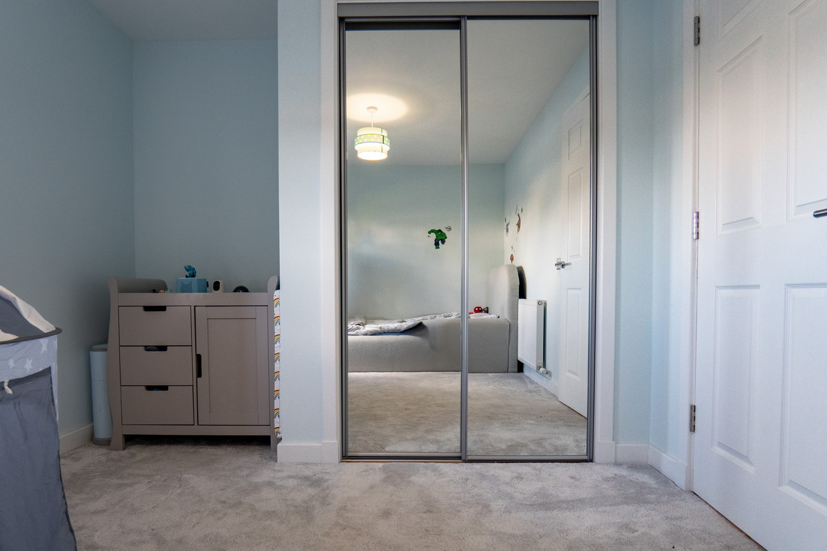 The second bedroom is another double, decorated in calm blue tones with neutral grey carpet. A large window brings in light while a radiator sits on the internal wall. A built-in mirror fronted wardrobe offers excellent storage and adds to the room’s sense of space.