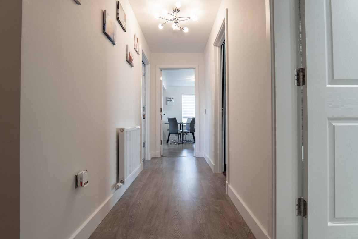 The hallway sets the tone with its clean white walls, wooden flooring and a large radiator to ensure the space stays warm. From here, the rooms flow easily throughout the apartment.
