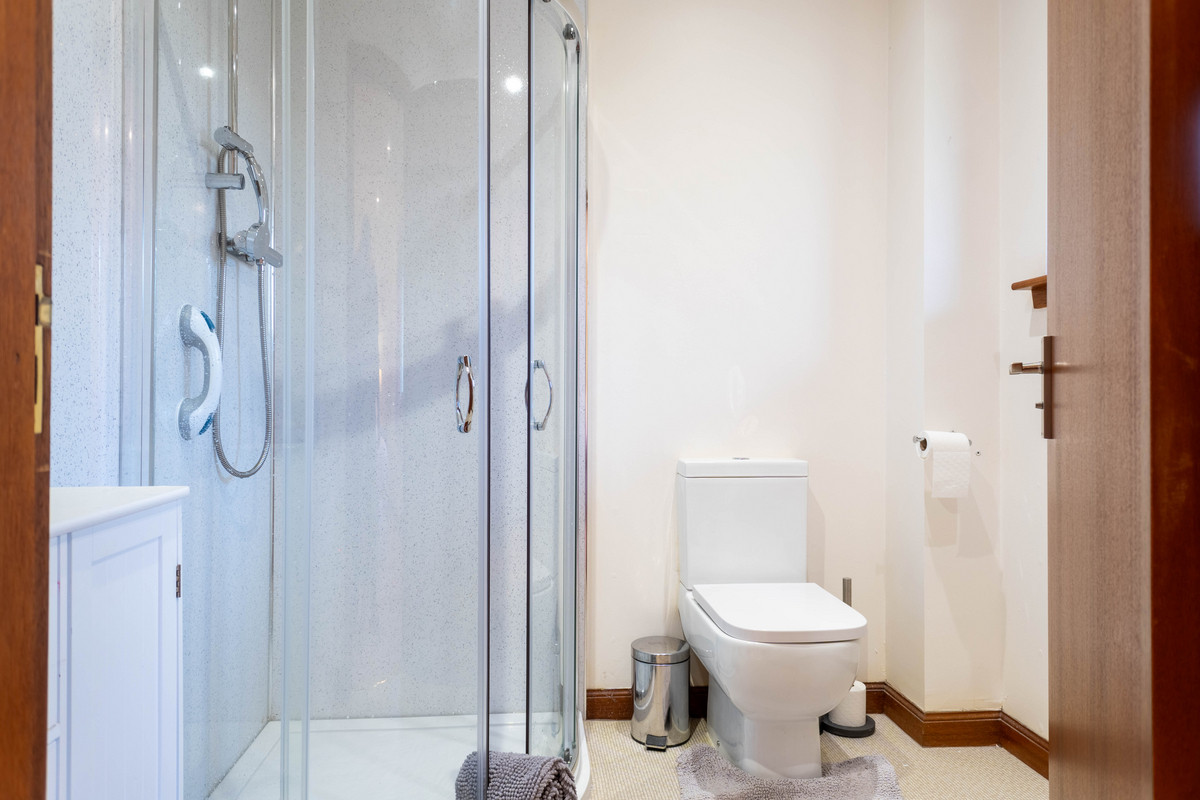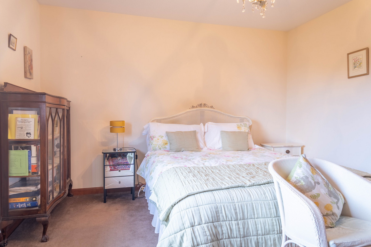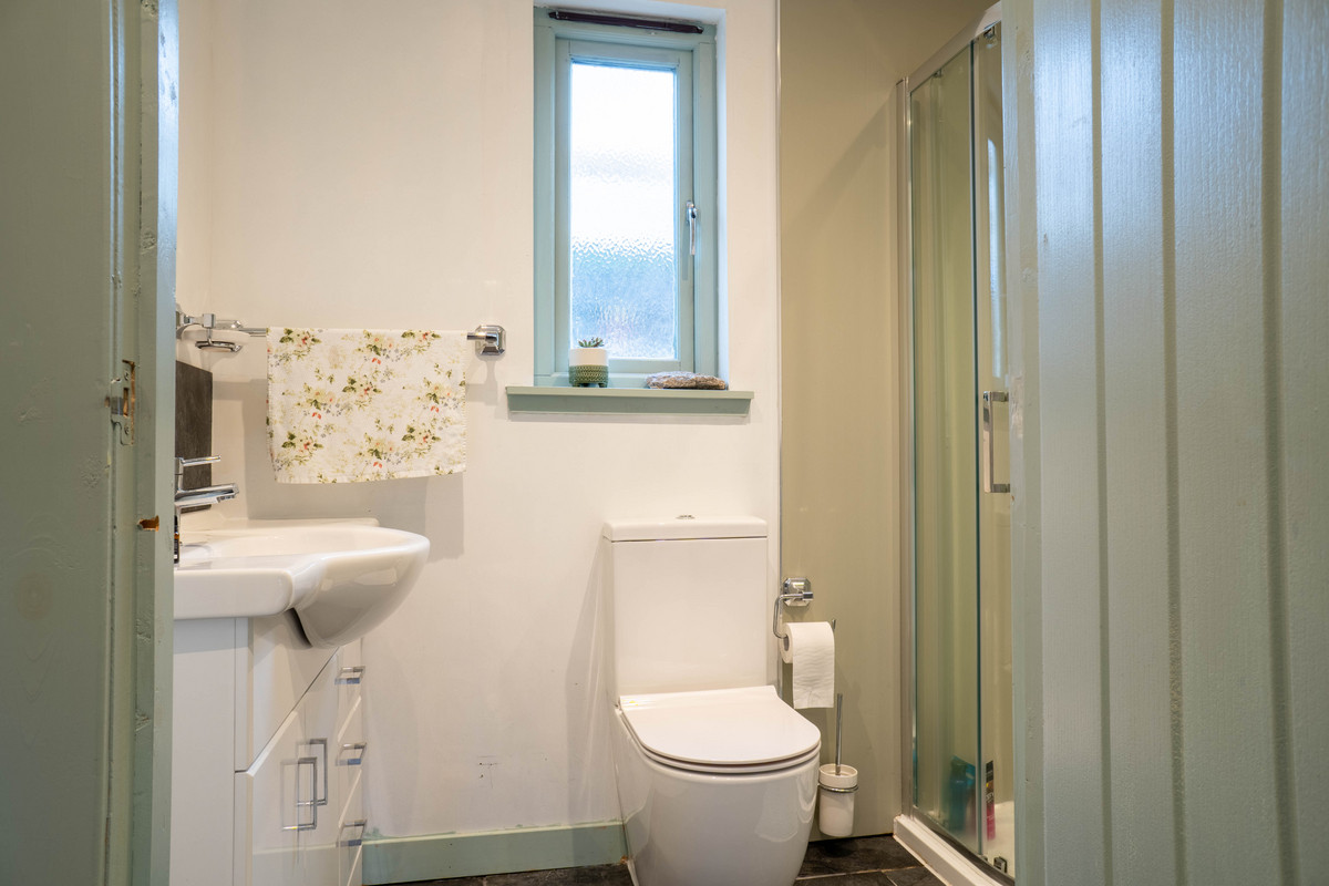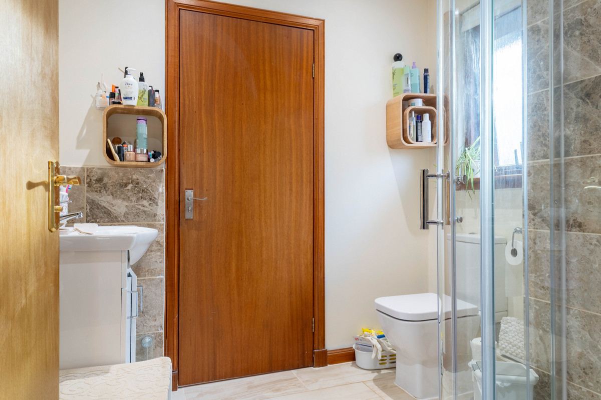 The main bedroom offers a spacious retreat, enhanced by large built-in wardrobes that provide ample storage for clothes and personal items. The en-suite shower room adds a touch of luxury, featuring a sleek silver shower cubicle with an electric shower finished with a pristine white suite including a modern toilet and sink. Each additional bedroom in the main house is generously sized and includes built-in wardrobes, ensuring ample storage for family members or guests. The family bathroom adds a touch of traditional charm with its white suite, rich wooden seat and gold-coloured fixtures on the bath, blending functionality with classic style.
