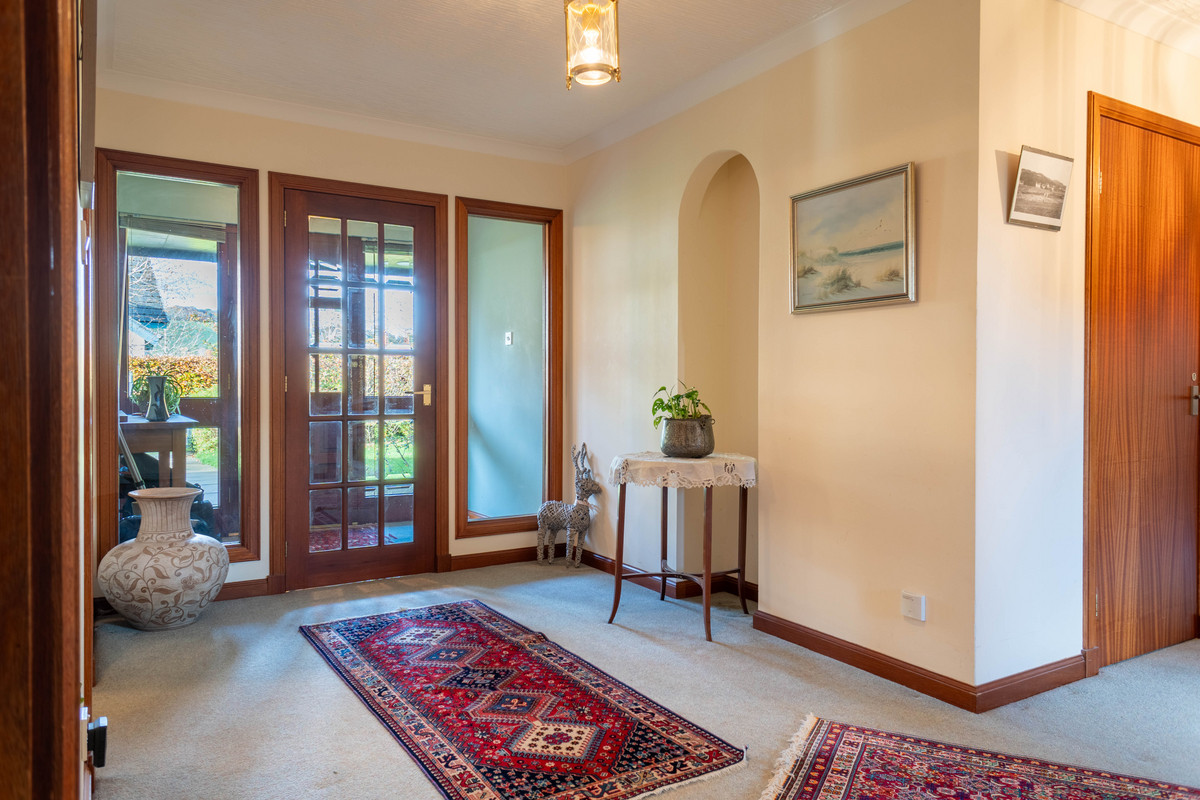 The main bungalow welcomes you through a light-filled vestibule and into a spacious hallway, leading to an expansive lounge adorned with a stunning stone fireplace, black tiled hearth and dark wood mantle, creating an impressive focal point. With soft cream walls, a large window that floods the space with natural light and ample room for seating, this living area is perfect for family gatherings or entertaining guests.